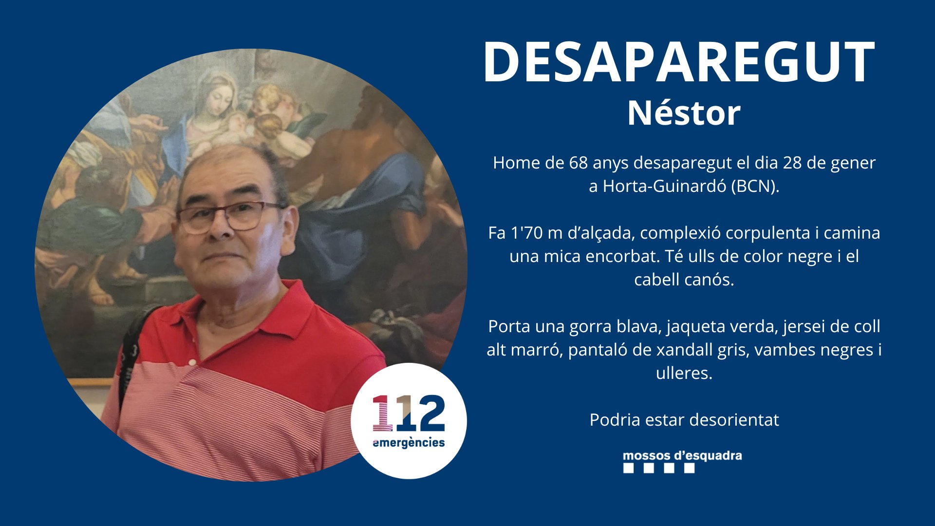Els Mossos d’Esquadra han activat una alerta per localitzar Néstor, un home de 68 anys que va desaparèixer el passat 28 de gener al districte d’Horta-Guinardó, a Barcelona. Des d’aleshores no se’n té cap notícia, i es demana la col·laboració ciutadana per ajudar en la seva recerca. La policia adverteix que podria estar desorientat, fet que incrementa la urgència per trobar-lo com més aviat millor.