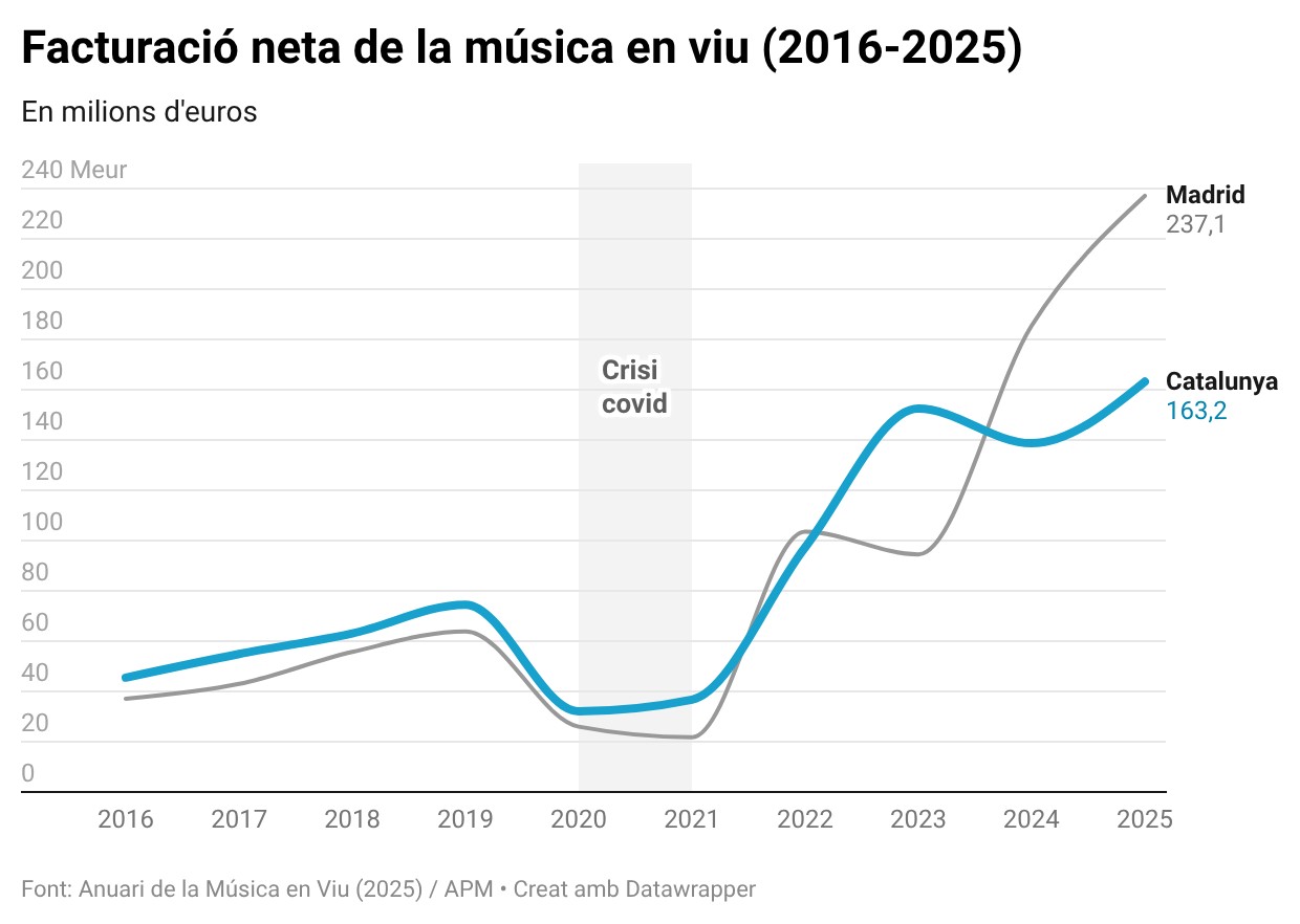 Són dades de l’Associació de Promotors Musicals (APM) recollides a l’Anuari de la Música en Viu 2025, que es publica aquest dijous.