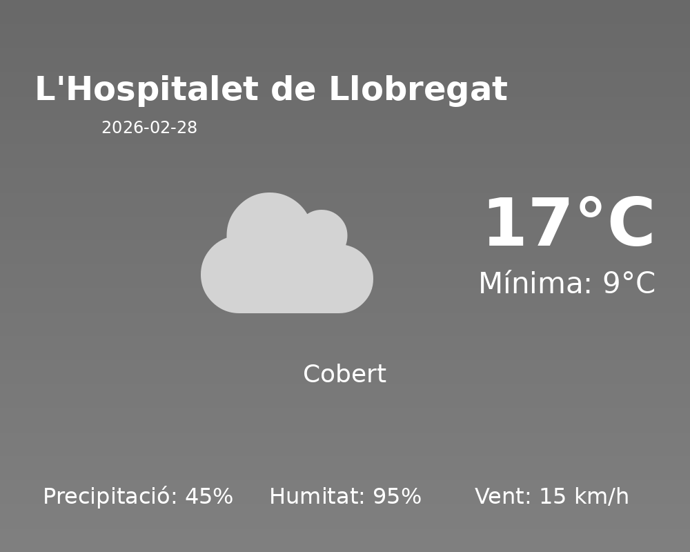 Avui, a L’Hospitalet de Llobregat, ens preparem per un dia de temps humit i inestable. Les temperatures es mantindran moderades, amb una màxima de 17°C i una mínima de 9°C. Aquestes condicions són típiques per a finals d’hivern a la nostra regió.